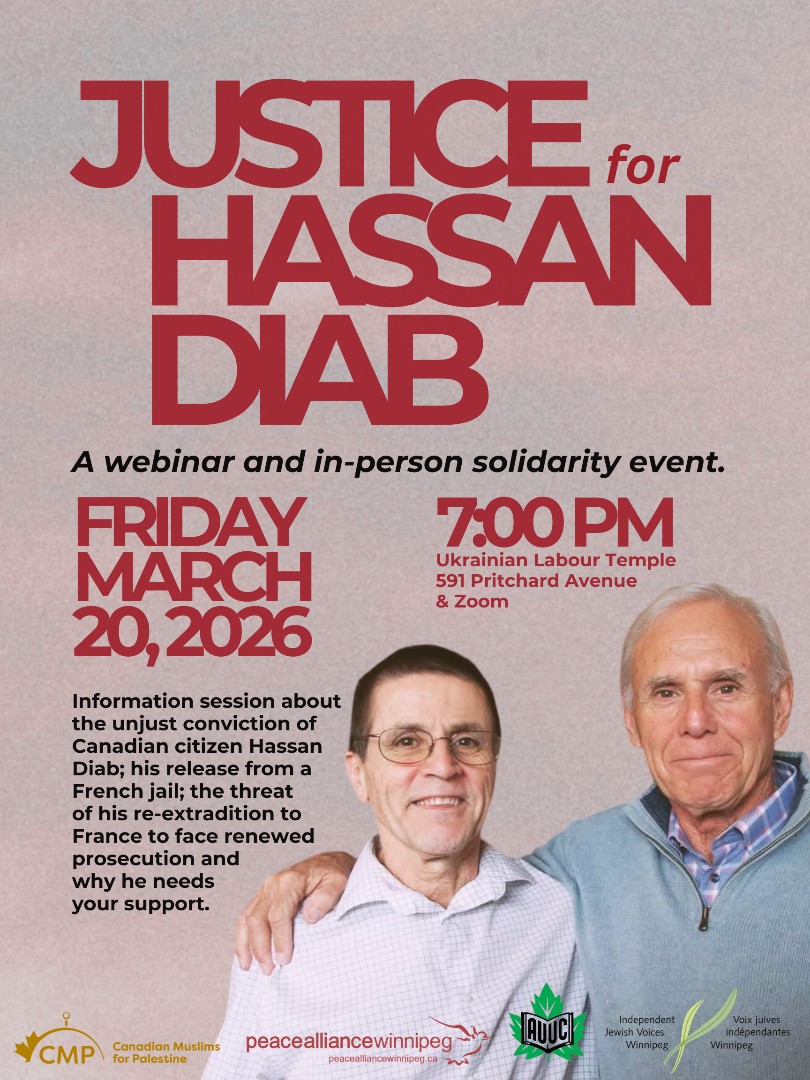 Join us on Friday, March 20, 2026, for a webinar and in-person information session in Winnipeg, Manitoba, hosted by Peace Alliance Winnipeg and other social justice organizations. Guests are welcome to attend online or in person.